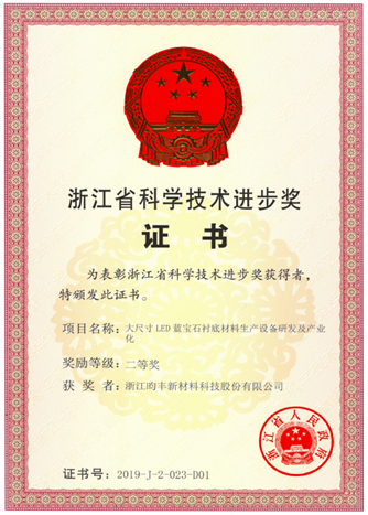 2020年7月17日,浙江省科学技术奖励大会在杭州隆重举行,昀丰科技“大尺寸LED蓝宝石衬底材料生产设备研发及产业化”项目喜获2019年度浙江省科技进步二等奖。